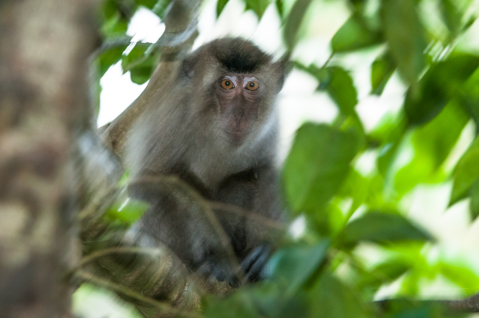 These long tailed macaques (also known as crab eating macaques) were fairly common around the hut I was staying at in Borneo. The light was low, so I decided to experiment with a few slow shutter flash exposures. This one was shot at just 1/8th of a second. The flash froze the eyes but little else. Nikon D300 with Nikkor 200-400mm lens (at 240mm) ISO 800, f/6.3 at 1/8th of a second, two Nikon SB-900 flash units