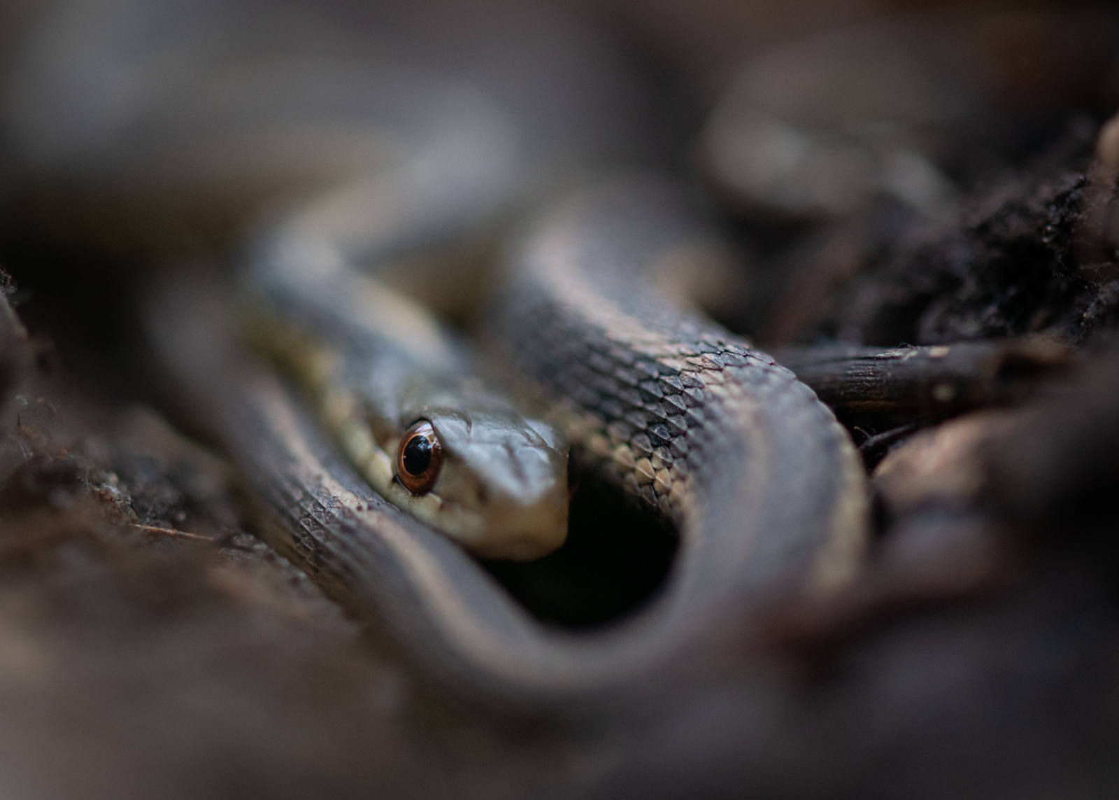 I found this tiny garter snake the other day when I was looking for salamanders. Couldn’t have been more than 8 inches long and thinner than a pencil. I used my macro lens without flash, so I had to open up the aperture to get enough light, making for a very narrow depth of field. I love the way you can see that thin line of focus as it slices through the image from the snake’s body to the left of its eye, then through the eye and onto the right side of the body and then up onto that stick just to the right of the snake. No more than a quarter of an inch of focus on a single plane running from the lower left to upper right. Nikon D850 with Nikkor 105mm macro lens, ISO 1600, f/4.2 at 1/50th of a second.