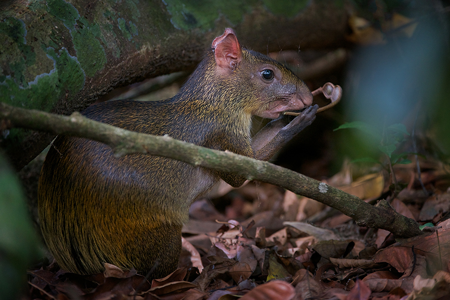To see an agouti is to appreciate an agouti. In photos they appear to be nothing more than a rat crossed with a squirrel. They are, in fact, rodents, but they are much more regal than your average squirrel. They are bigger too, and with long, slender legs. It would appear, they also sometimes wear glasses. This guy was actually chowing down on seed pods foraged from the leaf litter. Nikon D800 with Nikkor 200-400mm lens (at 400mm) ISO 3200, f/4 at 1/50th of a second