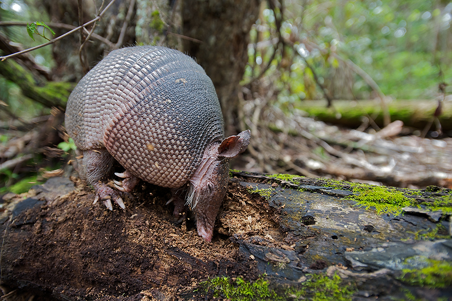 I spent quite a bit of time habituating this nine-banded armadillo on Merritt Island in Florida. Eventually it became comfortable enough with my presence to go about its business of digging frantically for grubs, termites, ants and other insects. Armadillos have very poor eyesight, but a great sense of smell and can detect prey through 8 inches of soil. If you look close, you can see the rotted bits of wood that the armadillo is tossing aside as it digs.