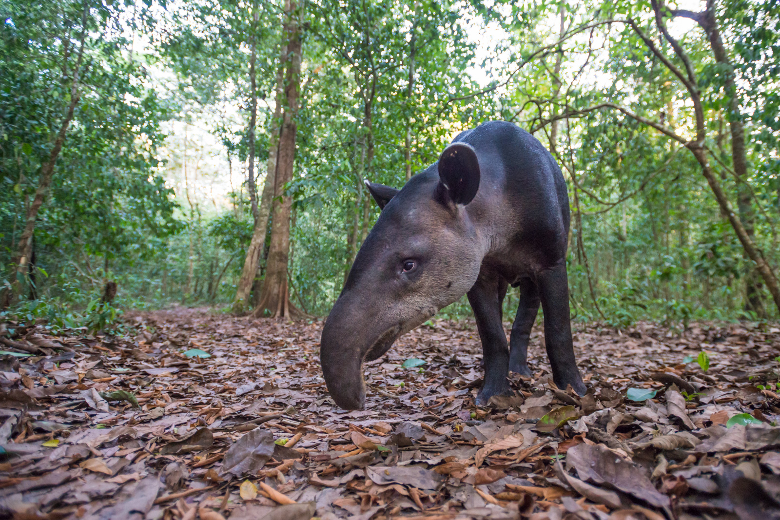 I was fortunate to get this close to a Baird’s tapir. They are usually pretty skittish but I remained very silent on the ground and, luckily, happened to have my wide angle lens handy when South America’s largest animal slowly made its way over to me (they can top out at almost 900 pounds and this one was a large male). The tapir was foraging through the fallen leaves in search of a few fresh ones to eat. I was able to snap off quite a few shots (on quiet mode) before the big guy moved off deeper into Corcovado National Park in Costa Rica. The distortion caused by the 17mm lens makes the tapir look much smaller than it actually was. Nikon D800 with Nikkor 17-35mm lens (at 17mm) ISO 3200, f/2.8 at 1/320th of a second