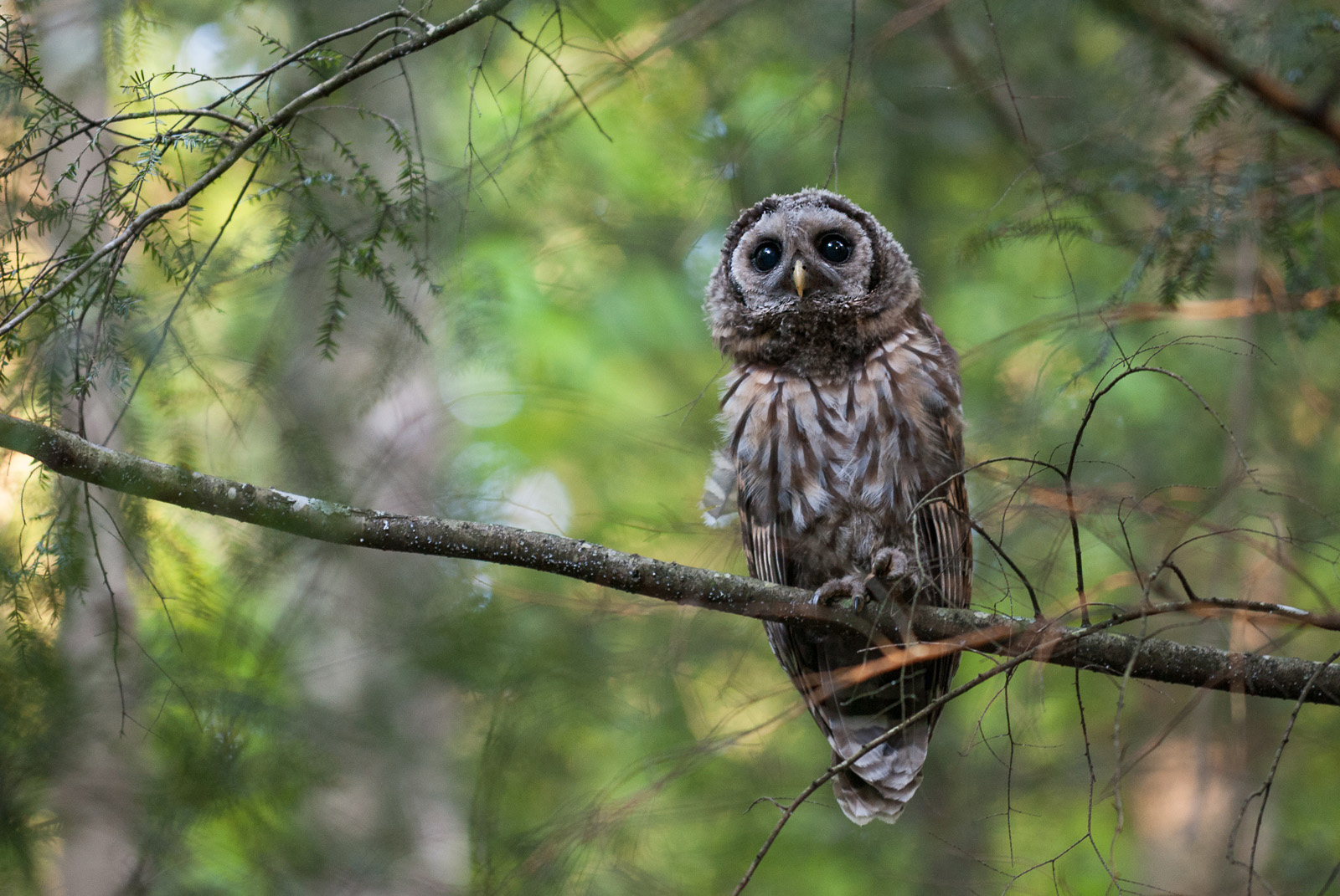 I photographed this young barred owl years ago in Tennessee’s Great Smoky Mountains National Park. It was hanging around the campground and was just getting the whole flight thing down. Nikon D200 with Nikkor 70-200mm lens (at 200mm) ISO 400, f/2.8 at 1/30th of a second.