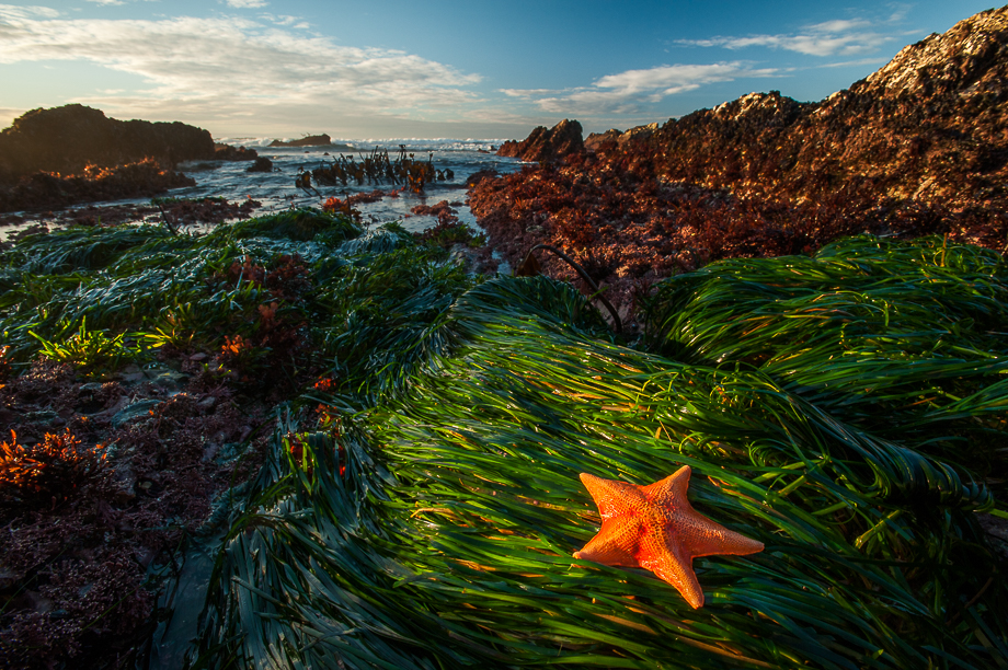 It’s been a while since I posted anything from the California tide pools. I photographed this bat star in the seagrass a few years back in Montana De Oro State Park in Los Osos, along the central coast. It’s hard to think of sea stars as animals, let alone fighters, but they will often battle each other when crossing paths. Unfortunately, I didn’t get to see this guy flex his muscles, as any would-be challengers were nowhere to be found. Nikon D700 with Nikkor 17-35mm lens (at 17mm) ISO 200, f/16 at 1/20th of a second