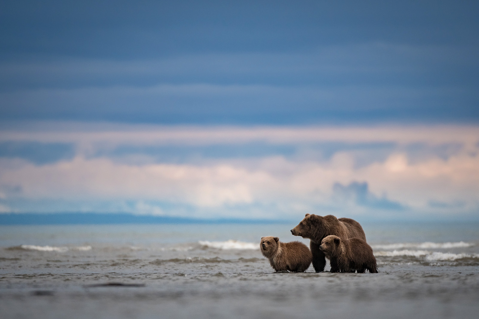 Low tide allowed this mother brown bear and her cubs to venture far from shore in search of breakfast. The area in which they are standing is at the confluence of a creek that feeds into the sea, bringing with it plenty of fish. Still, it’s a challenge for the mom, as the number of fish isn’t quite that of a full scale river spawn. Photographed at Silver Salmon Creek in Lake Clark National Park, Alaska. Nikon D500 with Nikkor 200-400mm lens (at 400mm) ISO 800, f/4 at 1/2000th of a second.