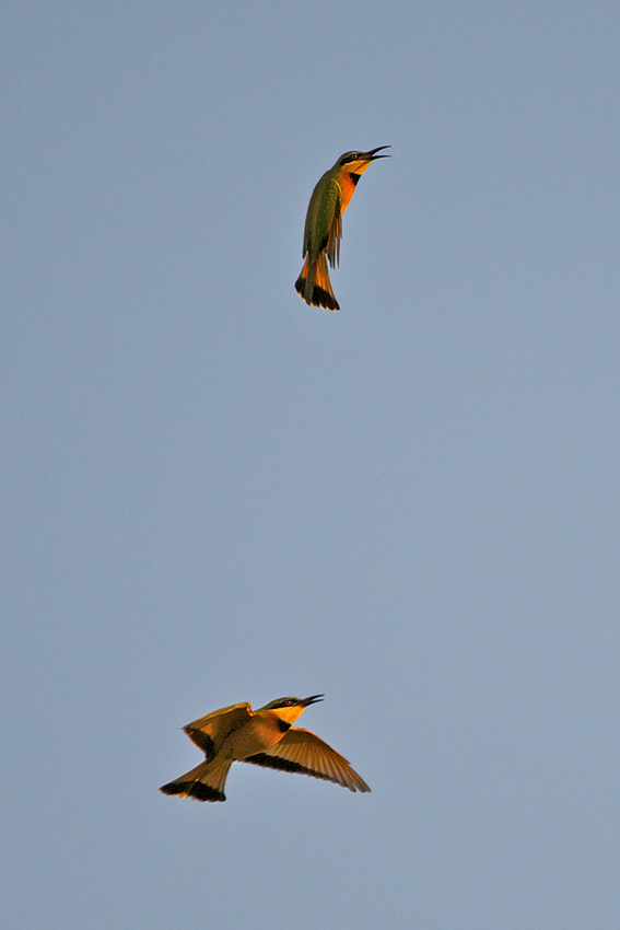 These guys are called little bee eaters. They are fairly common throughout sub Sahara Africa. As the name would suggest, they eat bees, and these two were doing just that as they darted through the air. Nikon D800 with Nikkor 200-400mm lens (at 400mm) ISO 400, f/4 at 1/1600th of a second