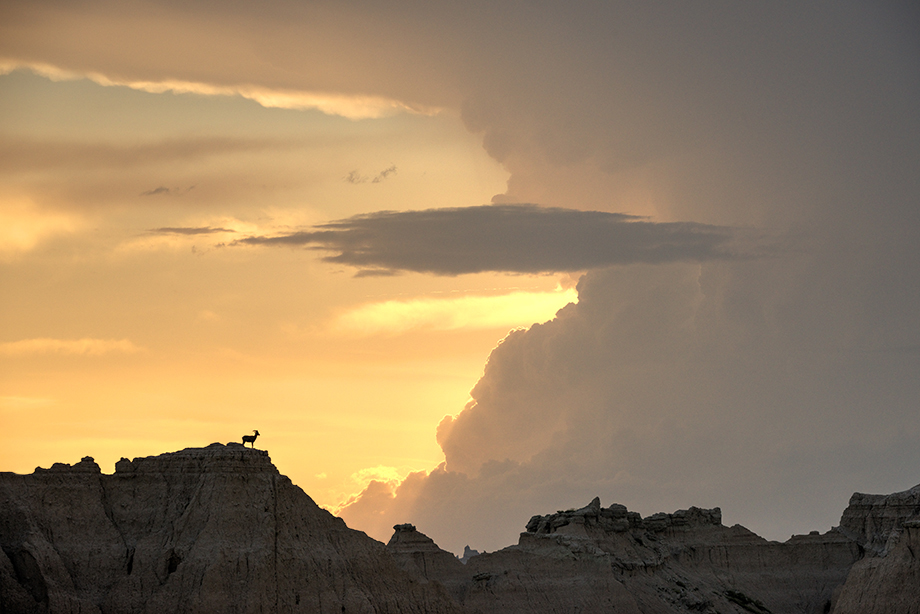 Just back from a few days in the Black Hills of South Dakota. Too many photos to go through at the moment and I need sleep, but here’s a quick one that I took yesterday in Badlands National Park. Look closely and you can see a bighorn sheep silhouetted against the great sky. Nikon D800 with Nikkor 200-400mm lens (at 250mm) ISO 400, f/8 at 1/640th of a second