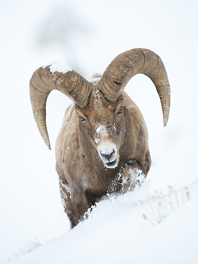 There were quite a few bighorn rams in Yellowstone this weekend. The ewes that I saw, on the other hand, were all just outside of the park. Rams and ewes only come together during mating season. The rest of the year the rams hang out in bachelor herds while the ewes hang out together and tend to the young. This guy was trudging through the snow looking for whatever vegetation he could find. Nikon D800 with Nikkor 200-400mm lens (at 340mm) ISO 400, f/4 at 1/2500th of a second