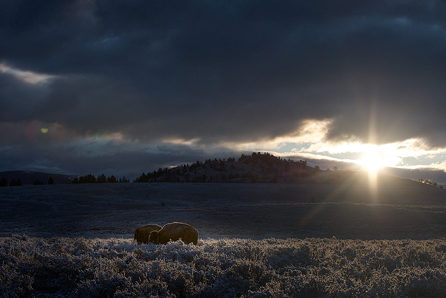 I captured this one on a dark morning in Yellowstone National Park (made even more dark by the fact that I was shooting into the rising sun). This was in late spring, but it had been very cold and every morning the ground was covered with frost.