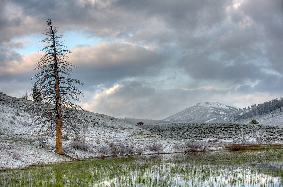 A bison walks along a shallow ridge line in Yellowstone National Park. This guy was taking his time catching up to the rest of the herd that had already descended to the far side of that small hill. Earlier a few had stopped to drink from the lake.