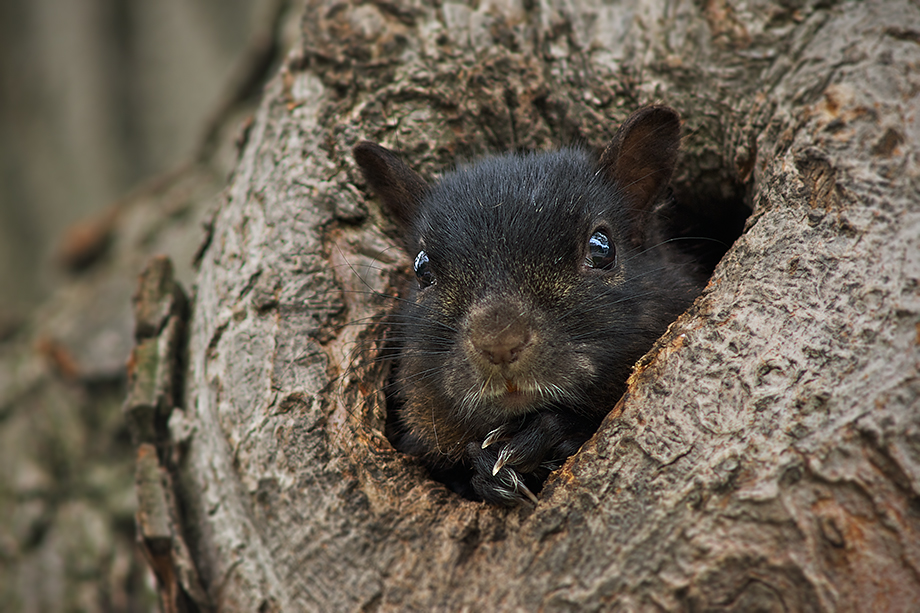 I was up in Bronxville, New York this past weekend at a house party and saw a few black squirrels running around in the back yard. It reminded me of the ones that I used to get at my house in Michigan, including this guy here peeking out of a hole in a tree. Black squirrels are actually a melanistic subgroup of the eastern grey squirrel that carry a mutant black pigment gene. They are common in the Midwestern United States, Ontario, Quebec and parts of the Northeastern United States and Britain. One theory suggests that they have thrived in these colder areas because their dark fur gives them the advantage of heat retention over grey colored squirrels.