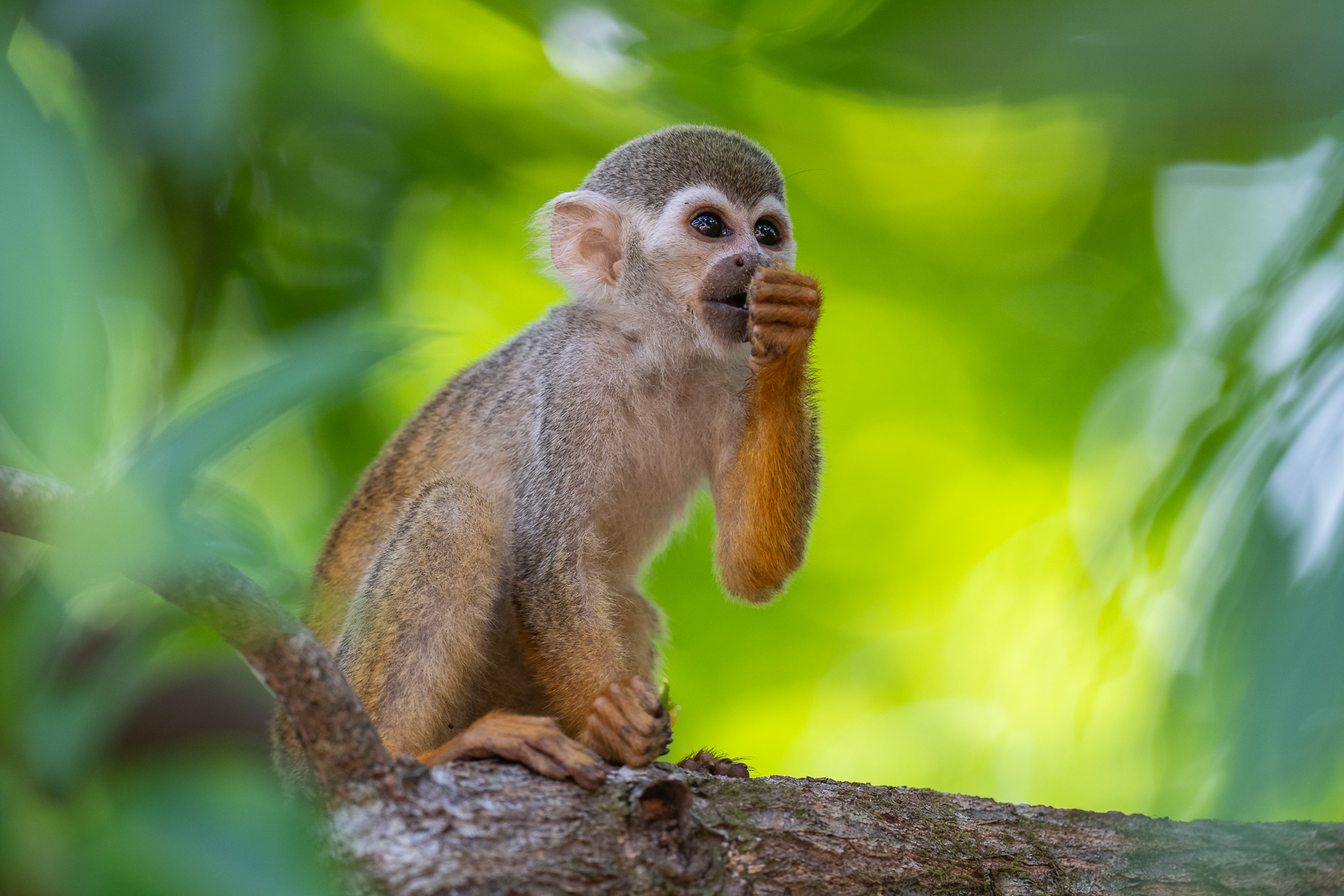 The Guianan squirrel monkey is a small, highly social primate found in the tropical forests of northern South America, especially in the Guianas and parts of the Amazon Basin. With bright yellow limbs, a white face, and a black cap on its head, it’s one of the most colorful members of the squirrel monkey group. These agile monkeys travel in large troops, sometimes over 50 individuals, leaping through the canopy in search of fruit, insects, and small vertebrates. Their constant chatter and quick movements make them both entertaining and challenging to observe in the wild. Nikon Z8 with Nikkor 500mm PF lens, ISO 1250, f/5.6 at 1/320th of a second.