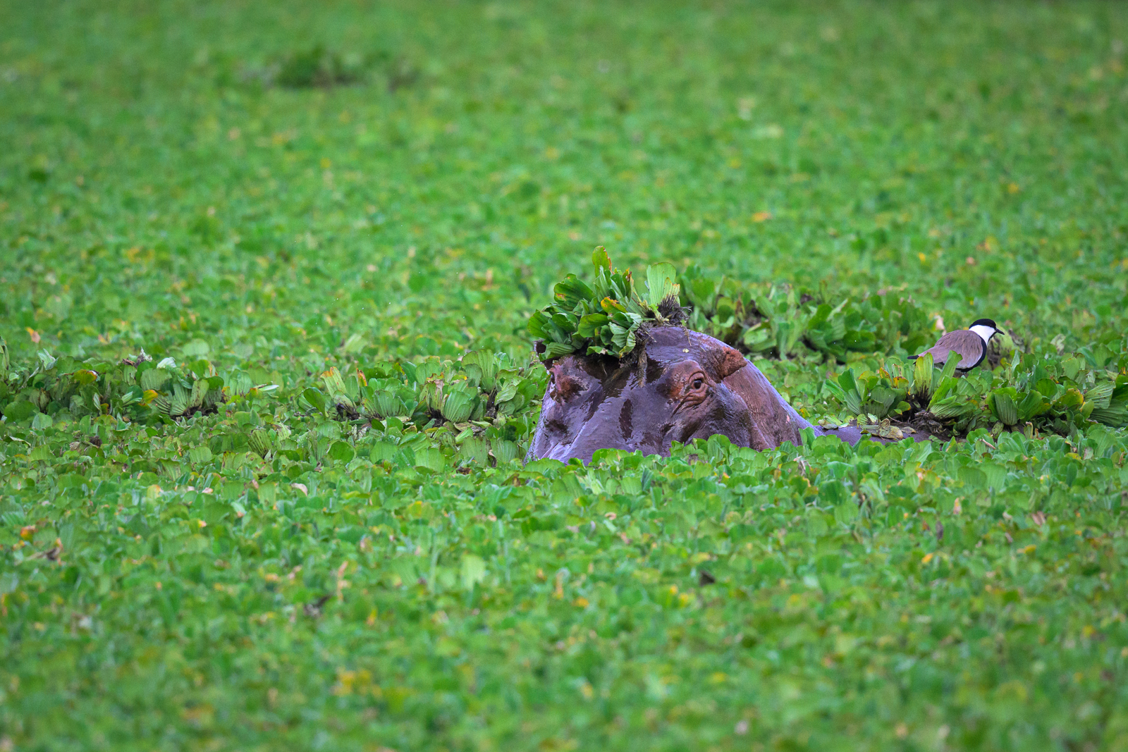 Hippos are often found wallowing in calm, shallow ponds filled with water lilies, where the floating vegetation provides both shade and camouflage. While hippos don’t eat the lilies themselves, their presence can help maintain open water channels through the dense growth. Nikon Z8 with Nikkor 500mm PF lens, ISO 1400, f/5.6 at 1/1250th of a second.