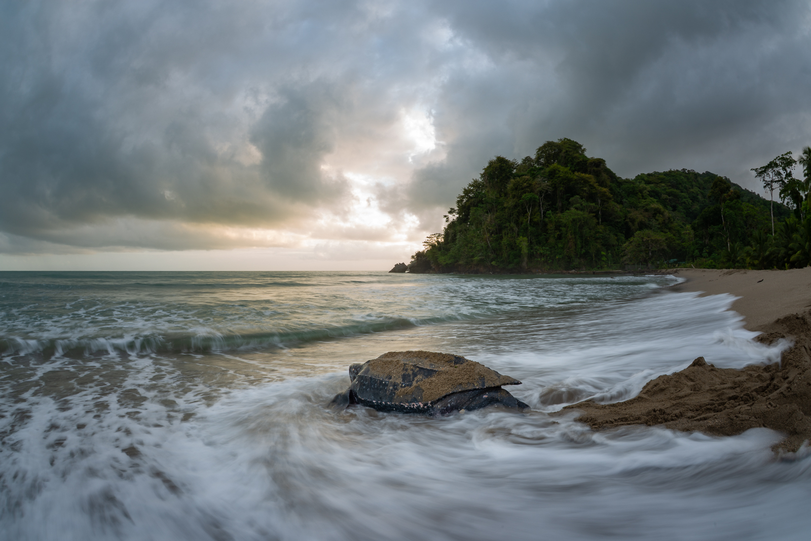 Emerging from the ocean under cover of night, female leatherback turtles, sometimes over 1,000 pounds, slowly haul themselves up the beach to dig a deep nest with their powerful rear flippers. They lay around 80 to 100 soft, ping-pong-ball-sized eggs, then carefully cover them with sand to hide them from predators. Once the task is complete, they lumber back to sea, leaving the next generation to incubate and hatch on their own. Nikon D800 with Sigma 15mm fisheye lens, ISO 50, f/22 at 1/3 of a second.