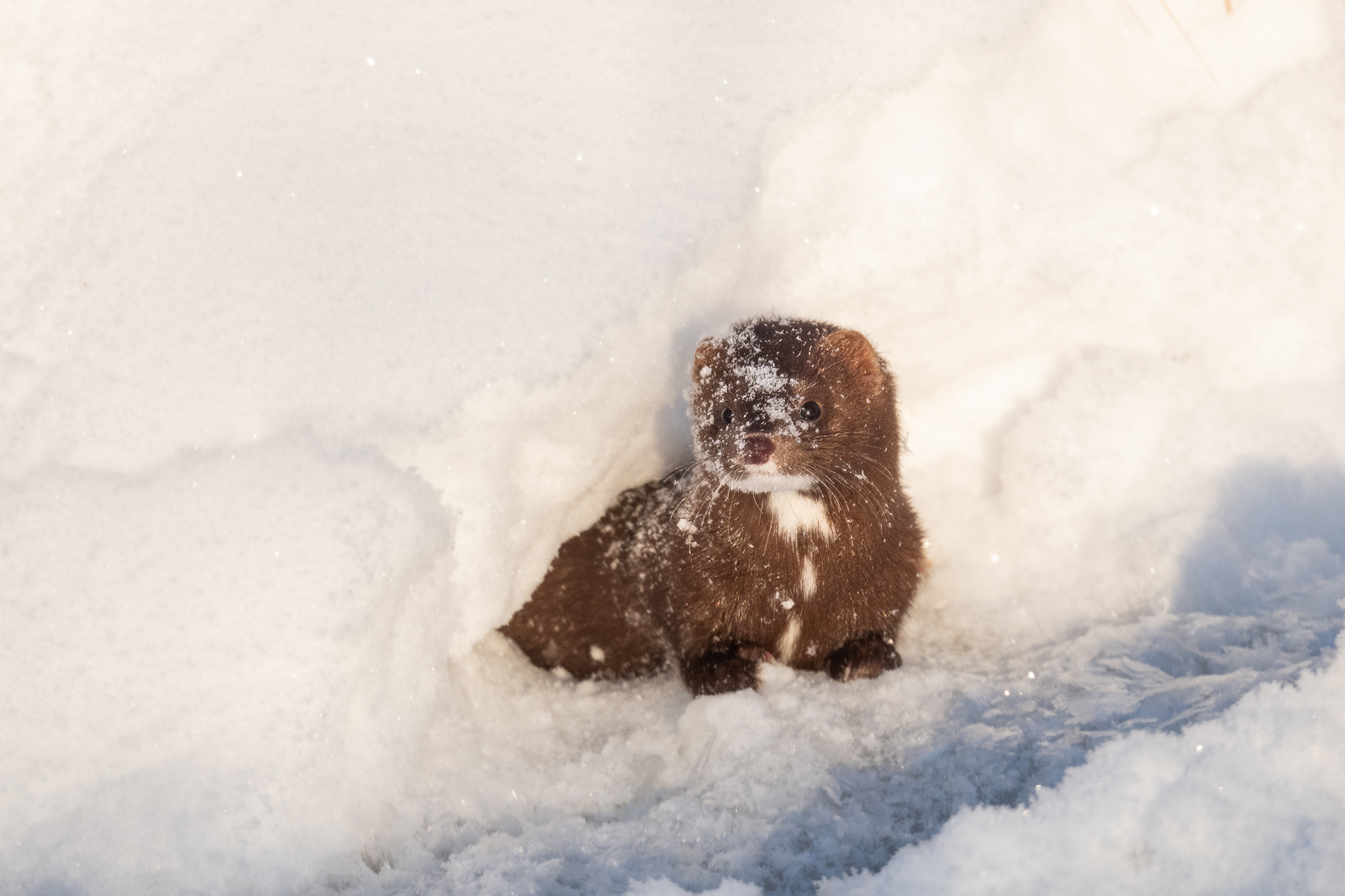 The American mink is a semi-aquatic predator often seen darting through snowy riverbanks and icy streams during winter. Agile and fearless, the mink hunts everything from fish and frogs to rodents and birds, often diving into icy water. Nikon D500 with Nikkor 500mm PF lens, ISO 800, f/5.6 at 1/2000th of a second.