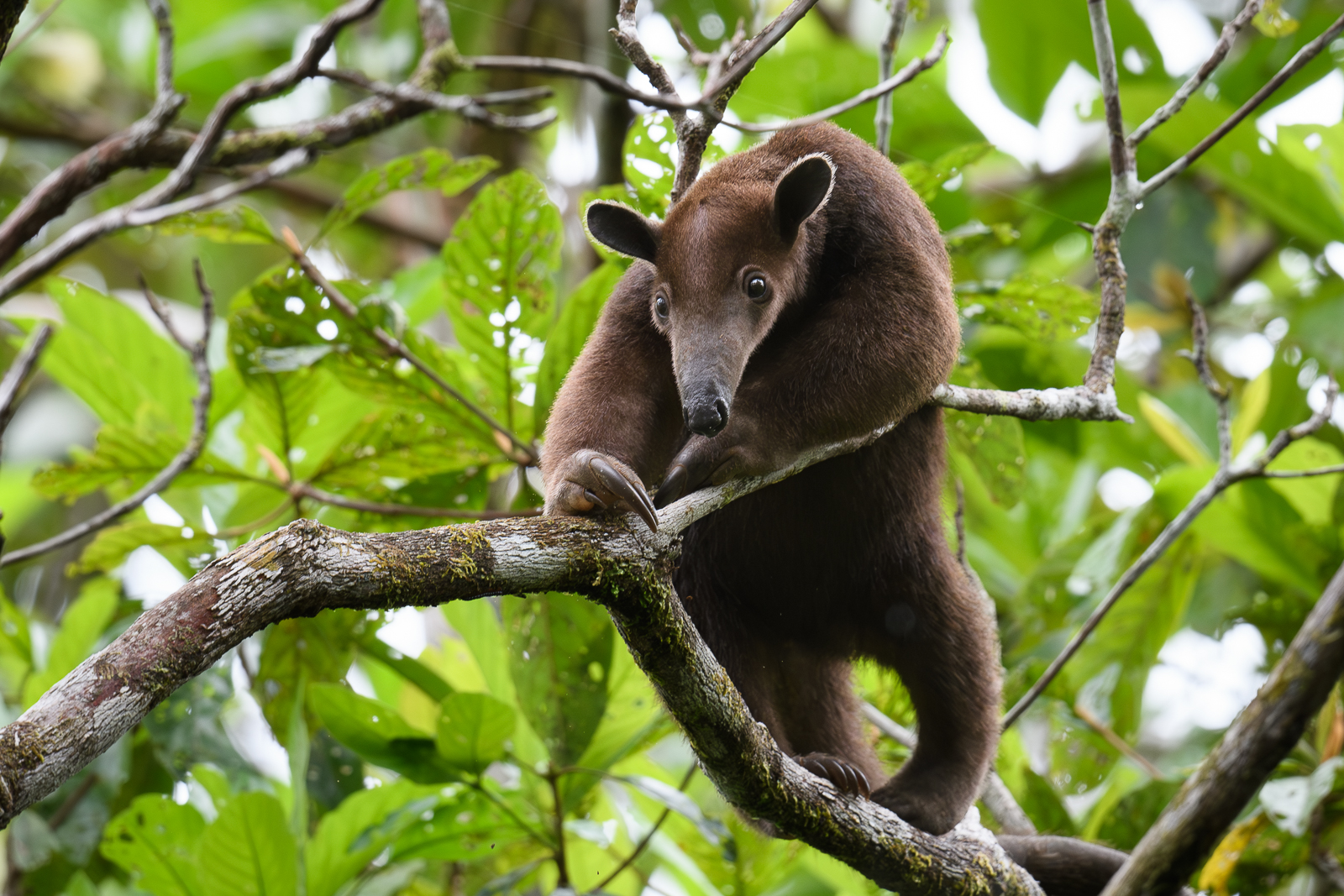 The dark morph of the southern tamandua is a rare variation of this anteater species, typically found in South American forests and savannas (this one in the upper Amazon basin of Peru). While most tamanduas have a pale coat with a black vest-like marking, the dark morph features much deeper overall coloring, sometimes appearing almost entirely chocolate brown or black. This unique coloration may offer better camouflage in dense, shaded rainforest environments. Like all tamanduas, the dark morph uses its powerful forelimbs and long claws to tear into termite mounds and ant nests, then slurps up insects with its long, sticky tongue. Seeing one in the wild is a special treat given how elusive and uncommon they are. Nikon D500 with Nikkor 500mm lens, ISO 1600, f/5.6 at 1/800th of a second.