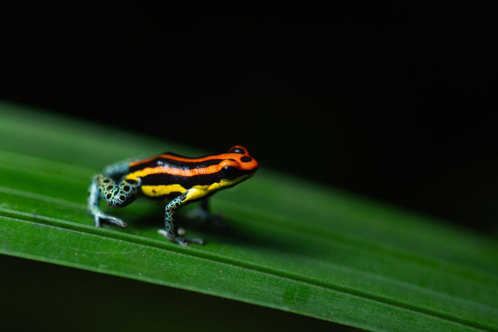 The Uakari poison frog is a tiny but vividly colored amphibian found in the lowland rainforests of Peru, especially in the Amazon basin. Its bright metallic reds, yellows and blues serve as a warning to predators, advertising the potent toxins in its skin. This species is one of the smaller poison dart frogs, often less than an inch long. They lay their eggs in water-filled bromeliads or tree holes, and parents often carry tadpoles on their backs to safe nurseries. Nikon D850 with Nikkor 105mm macro lens, ISO 400, f/5.6 at 1/60th of a second, Godox V860iii flash with Westcott Pocketbox diffuser.