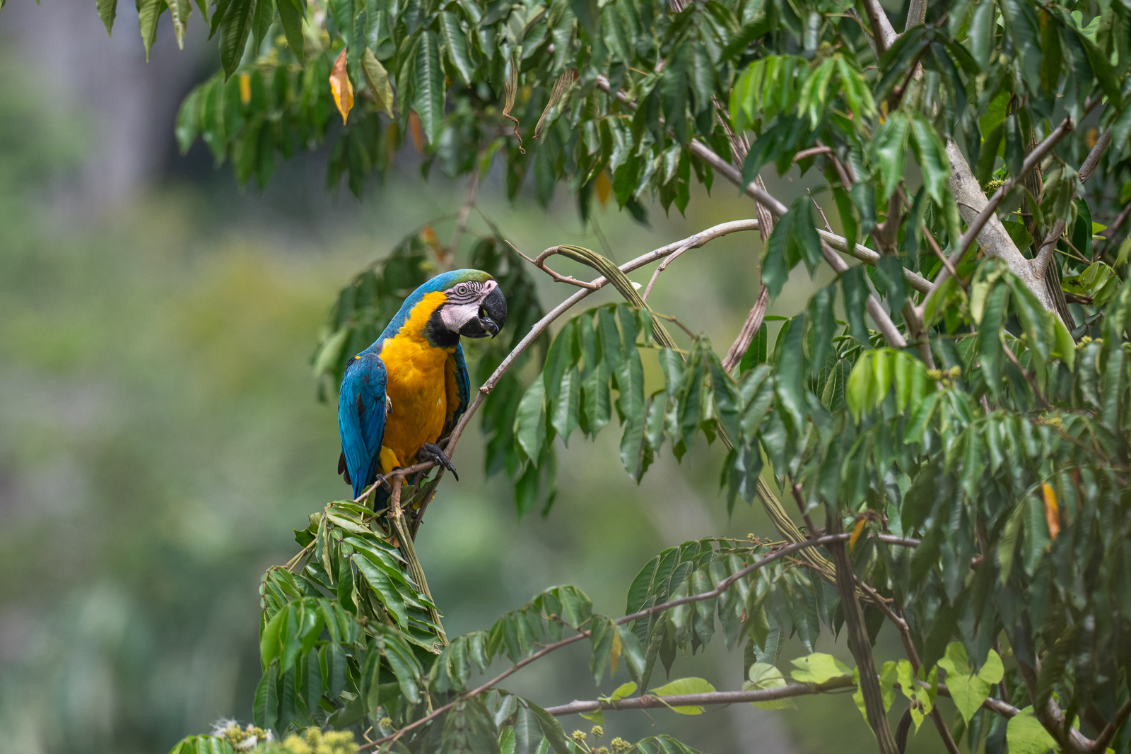While waiting for my plane at a grass airstrip in Guyana, I spotted a few blue-and-yellow macaws that were flying around the local village. This one ended up in one of the locals’ backyard. Also known as the blue-and-gold macaw, these parrots are as loud visually as they are vocally, often emitting raucous squawks that echo through the canopy (or the neighborhood). They are highly intelligent birds that form strong pair bonds and are often seen flying in mated pairs or social groups. Nikon Z8 with Nikkor 500mm PF lens, ISO 450, f/5.6 at 1/1000th of a second.