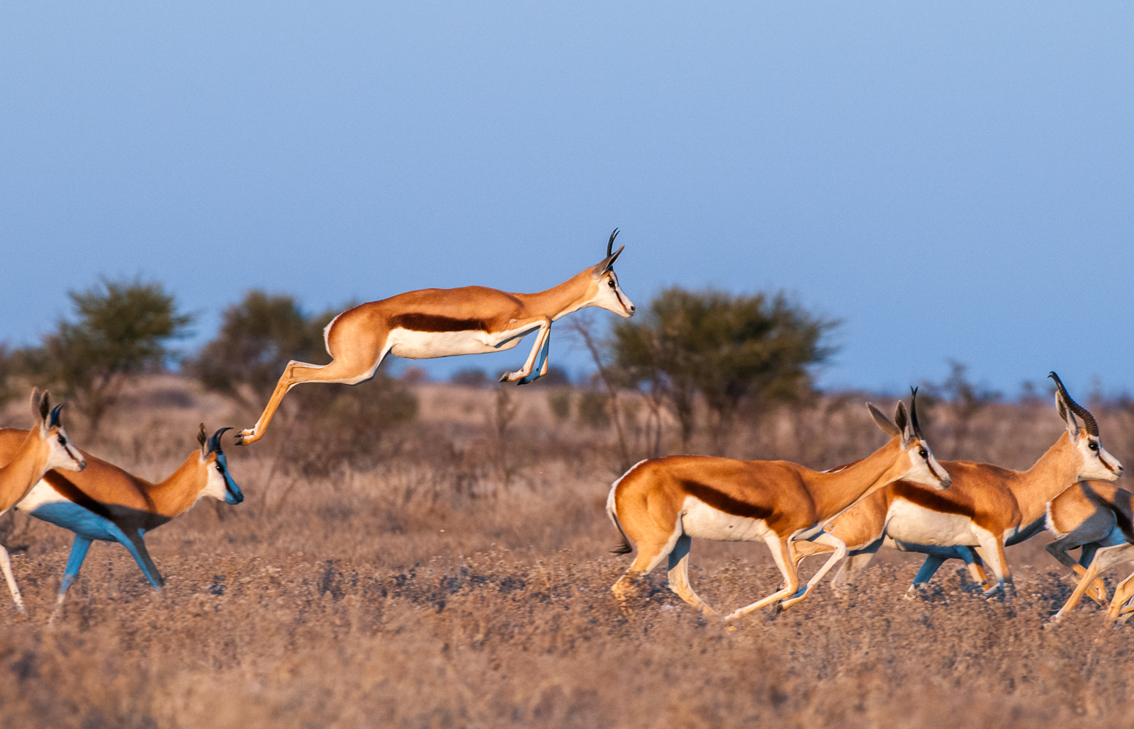 Pronking is the springbok’s signature move, a high, stiff-legged leap into the air. This dramatic display, where the animal can jump up to 13 feet, is thought to signal strength and agility to predators, discouraging pursuit. It may also serve as a form of play or social communication within the herd. With a flash of white from the flap of skin along its back and bursts of athletic energy, a pronking springbok is one of the most iconic sights on the African savanna. I photographed this one in the Kalahari Game Reserve of Botswana on my first trip to southern Africa in 2011. Nikon D300 with Nikkor 200-400mm lens (at 400mm) ISO 800, f/6.3 at 1/800th of a second.