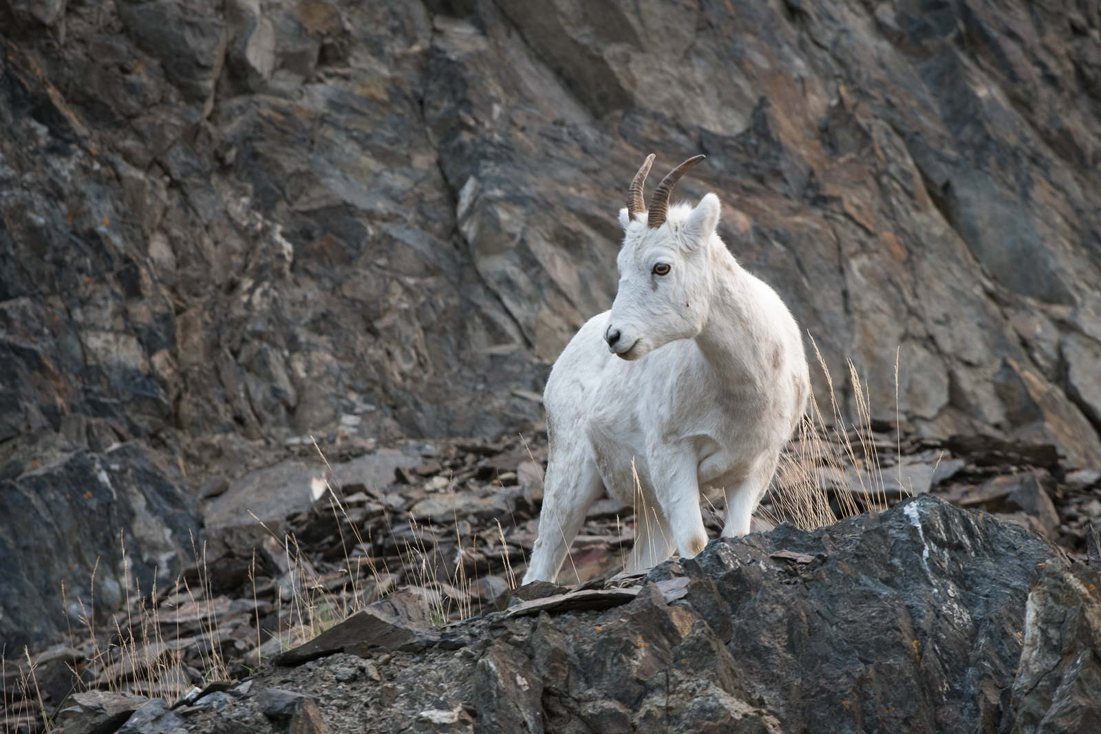 Dall sheep are white mountain dwellers native to the rugged peaks of Alaska and northwestern Canada. Their bright coats blend perfectly with snow-covered cliffs, offering camouflage from predators like wolves and eagles. Agile and sure-footed, they navigate steep, rocky terrain with ease, often scaling near-vertical slopes to escape danger. This one was photographed just outside of Anchorage a few years back. Nikon D500 with Nikkor 200-400mm lens (at 350mm) ISO 800, f/5.6 at 1/200th of a second.