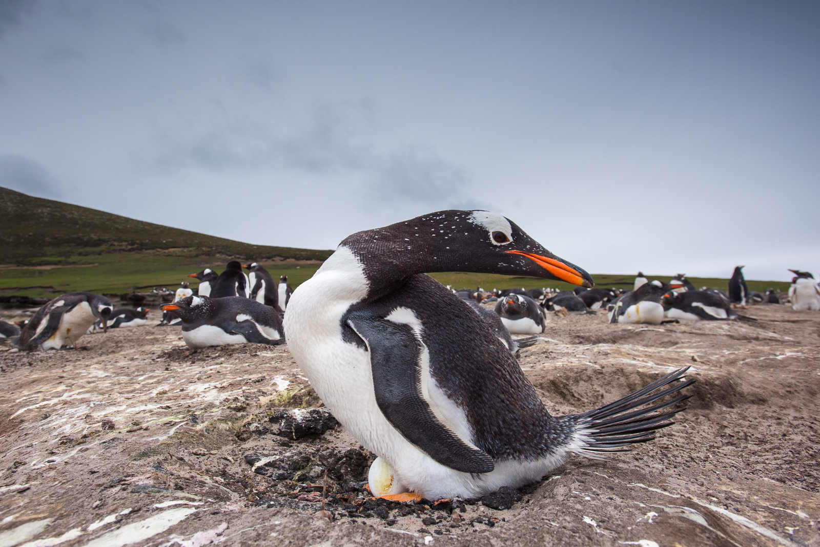 Female gentoo penguins typically lay two eggs, and both parents take turns incubating them, carefully balancing the eggs on their feet and under a warm flap of abdominal skin called a brood pouch. Shifts can last for days, with one adult guarding the nest while the other forages at sea. Once the chicks hatch, both parents continue to share duties, feeding them regurgitated food and shielding them from the cold and predators. Nikon D810 with Nikkor 17-35mm lens (at 19mm) ISO 800, f/8 at 1/640th of a second.