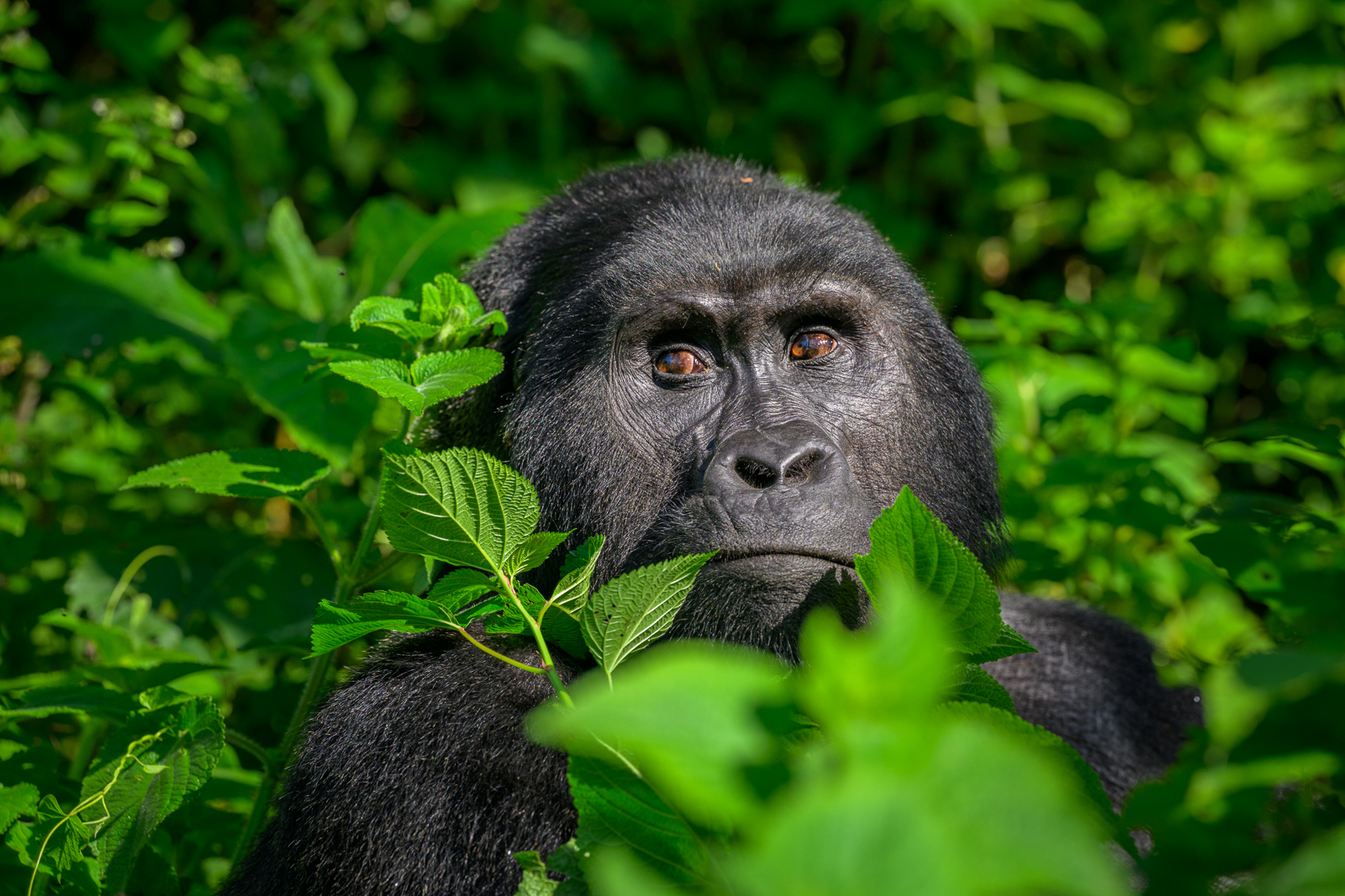 Photographing mountain gorillas can be a challenge, even though you can get extremely close. You can only be with the gorillas for an hour once you find them and there’s no guarantee on the setting or the light. On our last trip, the thick vegetation and bright sunshine definitely presented some difficulties, but every now and again a gorilla turned to a favorable angle to the sun and I was able to get a handful of shots that I liked. A polarizing filter also came in handy to take the bright spots off the leaves. Nikon Z8 with Nikkor 70-200mm lens (at 135mm), ISO 1000, f/5 at 1/640th of a second.