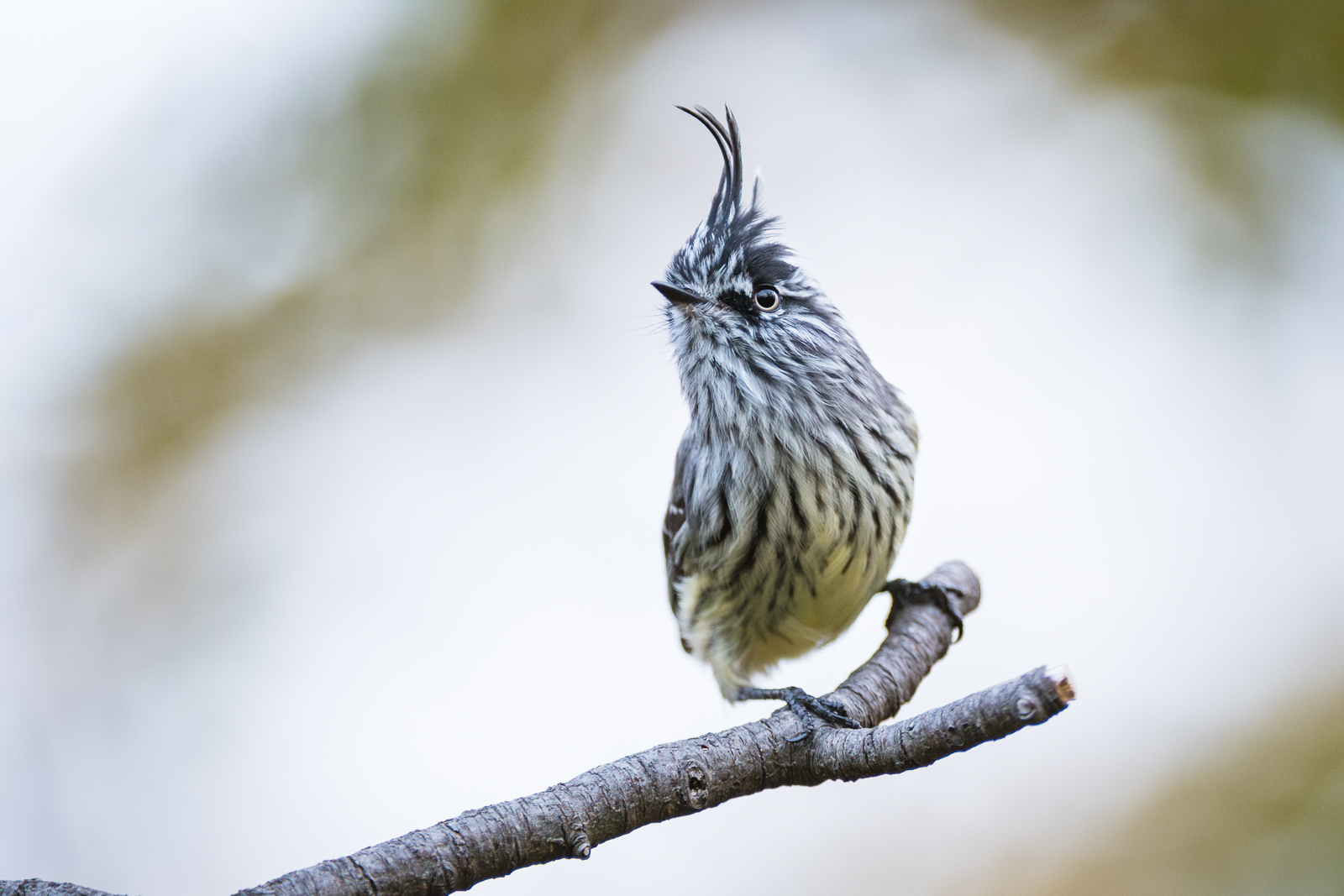 The tufted tit-tyrant is a tiny flycatcher found in the Andean regions of South America. Despite its small size, it sports a bold personality and an impressive spiky crest that gives it a perpetually surprised look. This active little bird flits constantly through shrubs and low branches, hunting insects with quick, darting flights. Its name reflects both its appearance and its feisty, territorial behavior, often chasing off much larger birds from its space. Nikon D500 with Nikkor 200-400mm lens (at 400mm) ISO 1600, f/4 at 1/400th of a second.