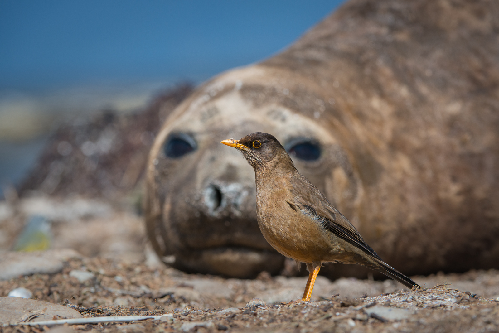 What the Falkland thrush lacks in the way of colorful plumage, it makes up for with its spectacular song. This one was performing for the local elephant seals on Carcass Island. Nikon D800 with Nikkor 200-400mm lens (at 260mm) ISO 400, f/6.3 at 1/1600th of a second.