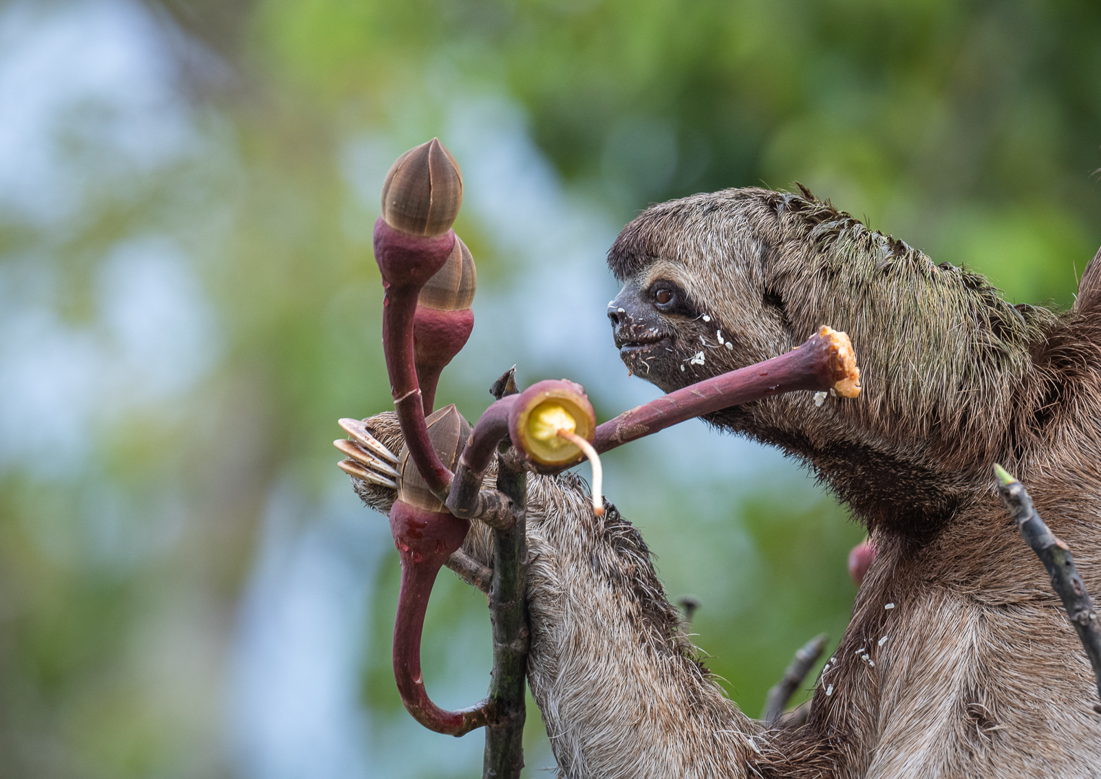 In Peru’s northern Amazon basin, three-toed sloths are often seen slowly munching on the buds, fruits, and tender leaves of the Cecropia tree, a favorite food source that’s both abundant and easy to digest. These trees grow quickly along forest edges and gaps, making them a vital part of the sloth’s high-canopy diet. Nikon D500 with Nikkor 500mm PF lens, ISO 800, f/6.3 at 1/500th of a second, Godox 860iii fill flash.