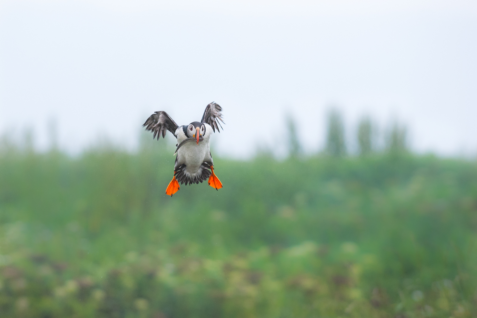 Here’s an old one from way back in 2008 on Machias Seal Island off the coast of Maine. Atlantic puffins nest in burrows dug into the grassy soil or between rocky crevices. They return each spring to the same site, where pairs reunite and raise a single chick. Puffins here primarily feed on small fish like herring, sand lance, and hake, which they catch during short dives close to shore. Nikon D200 with Nikkor 70-200mm lens (at 200mm) ISO 200, f/4 at 1/2000ht of a second.