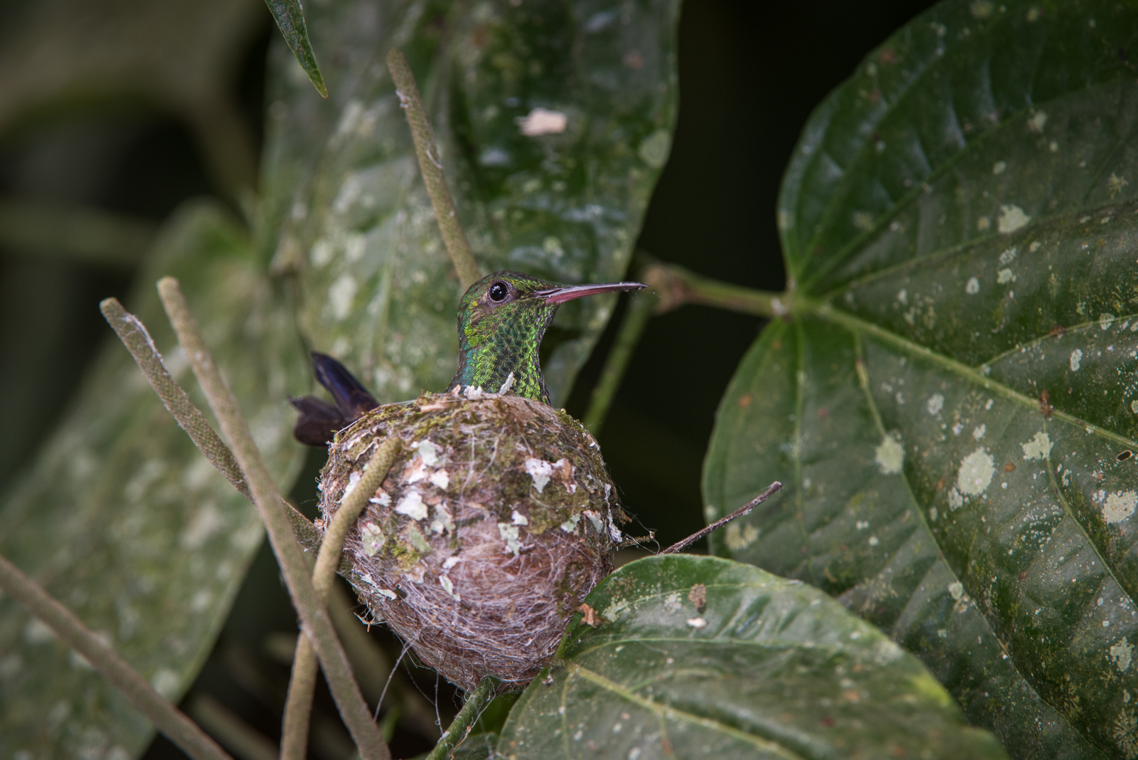 I spotted this copper rumped hummingbird in its nest while visiting the highlands of Trinidad. Hummingbird nests are very small. About the size of a golf ball, but intricately woven from soft plant fibers, spider silk, and bits of lichen for camouflage. The spider silk gives the nest flexibility, allowing it to stretch as the chicks grow. Typically built on thin branches or sheltered spots, the nests are marvels of engineering, designed to hold two jellybean-sized eggs. They can be very tough to spot, blending seamlessly into their surroundings. Nikon D810 with Nikkor 200-400mm lens (at 400mm), ISO 400, f/8 at 1/60th of a second.