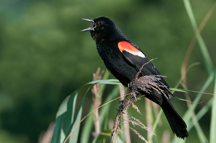 I came across this male red-winged blackbird one morning last summer at the Wellfleet Wildlife Sanctuary in Cape Cod, Massachusetts. He must have been protecting a nest that was very close to a little bridge over a pond because when I walked past, he started chirping noisily and even took a few dives toward my head. These birds are fairly common throughout the US and into Central America. I see them a lot when driving around the country. The male has the namesake red wings, whereas the female is a nondescript brown color.