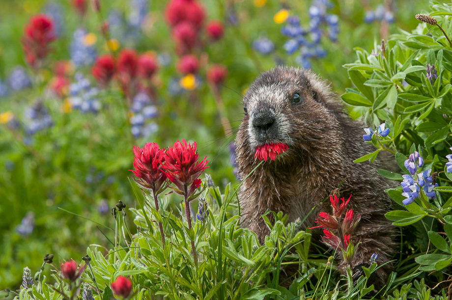 Another hoary marmot from Mount Rainier National Park in Washington. This guy was clearly more partial to the red indian paintbrush than to the other flowers.