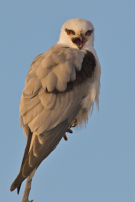 Black shouldered kites — also known as Australia black shouldered kites — are found in open habitat throughout much of Australia. They are smaller raptors, with a wingspan of up to 37 inches. Mostly white and grey in appearance, they have piercing red eyes set against patches of black — very cool looking birds. I saw this one on my last morning on Kangaroo Island in Southern Australia.