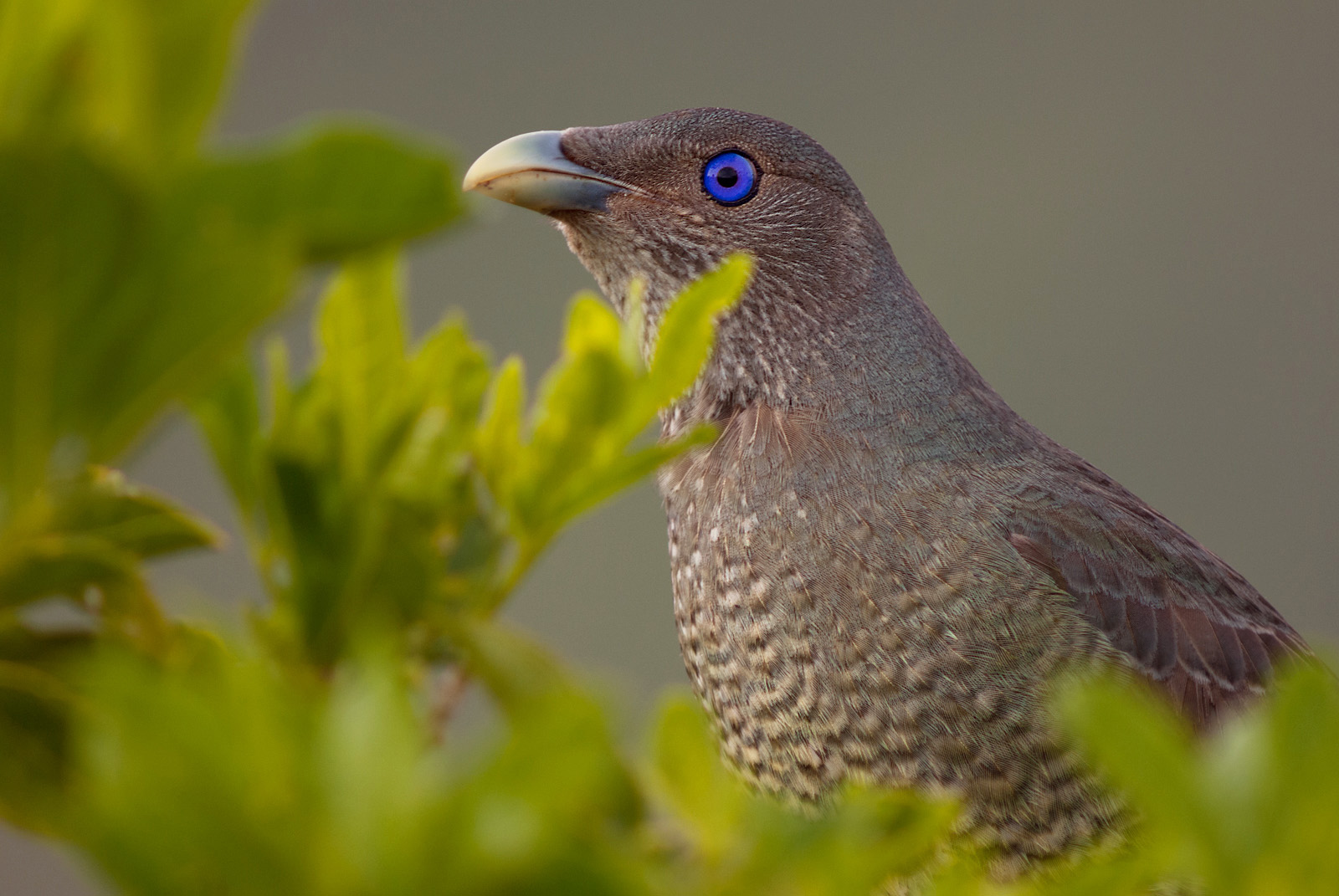 Bowerbirds are pretty interesting when it comes to mating behavior. The male creates an elaborate structure (or bower) on the ground — made up of twigs and other brightly colored objects. Apparently the ladies find the construction of such a structure to be irresistible. The male satin bowerbird is a uniformly purplish black color. The female is more of a speckled brown. They both have that striking purple/blue eye. Photographed in Lamington National Park near Brisbane, Australia. Nikon D200 with Nikkor 600mm f/5.6 manual focus lens, ISO 200, f/5.6 at 1/200th of a second.
