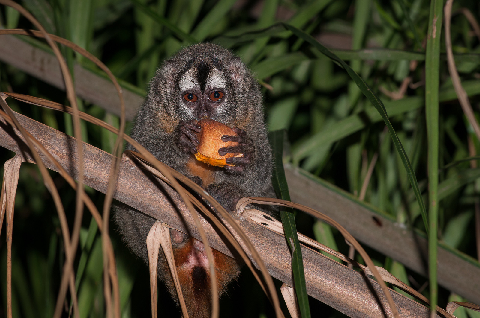This is the Azara’s night monkey, enjoying a mango, photographed one night in the Pampas region of Bolivia. After a few bites, he took his meal and disappeared into the forest. Nikon D300 with Nikkor 70-200mm lens (at 200mm) ISO 200, f/5.6 at 1/60th of a second, two Nikon SB-800 flash units.