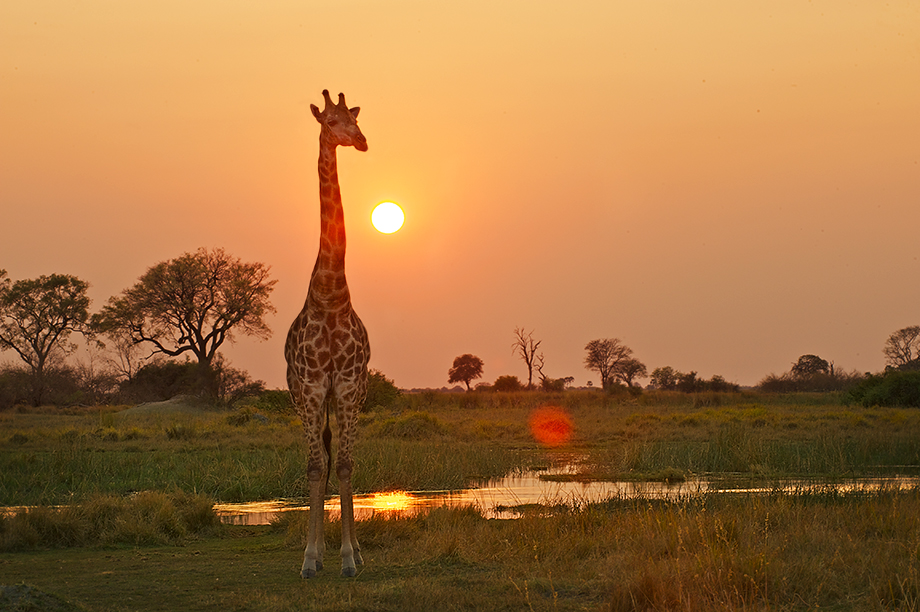 This was the last morning of our trip to Botswana. Much like the first five mornings, a big orange sun rose at six a.m. into a cloudless sky. The sun was still low enough for some decent shots when we came across a solitary giraffe. I was hoping the big guy would entertain us with a drink at the water hole, but he seemed a bit timid, perhaps because he was on his own in an open area and sensed danger. Giraffes put themselves in a vulnerable position when they splay their legs and take the considerable effort to quench their thirst. Instead, I took a few portraits and we moved on. Nikon D700 with Nikkor 70-200mm lens (at 130mm) ISO 560, f/22 at 1/20th of a second