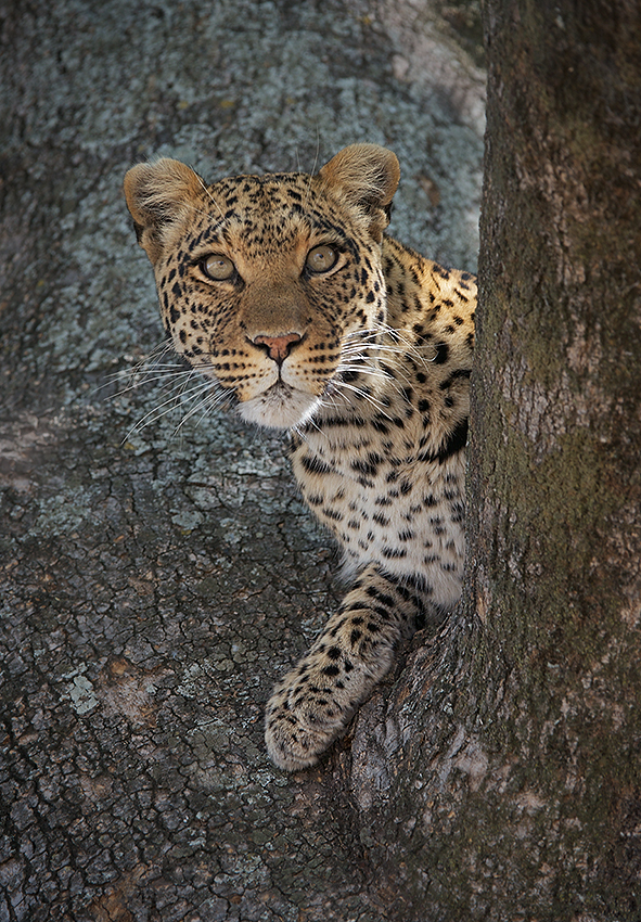 We ran into this leopard several times during our six days in Botswana. On this encounter, she was sitting in a sausage tree waiting for impala to walk beneath to eat the flowers that had fallen on the ground. From the reports we heard back at the camp, we just missed the action. She sat patiently for hours until a small herd, noses to the ground, came foraging for the flowers. Then she dropped from the tree and killed one of the unsuspecting impala. We would later catch up with her again with the fresh kill. Nikon D800 with Nikkor 200-400mm lens (at 300mm) ISO 800, f/5.6 at 1/500th of a second