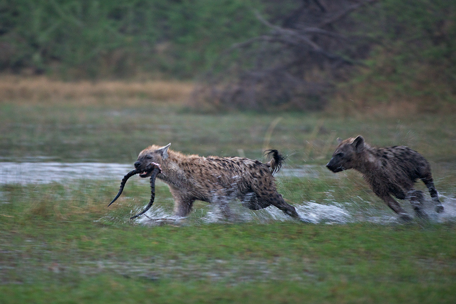 Here’s another one of spotted hyenas playing keep away with a pair of impala horns. This was taken first thing in the morning in a swampy area of northern Botswana. The light was very low, as was my shutter speed, so I was hoping for the hyenas to run parallel to me so that I could pan with their movement to capture some relatively sharp, motion-blurred action shots. Nikon D800 with Nikkor 200-400mm lens (at 400mm), f/4 at 1/80th of a second