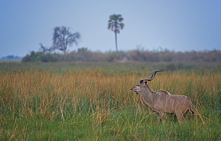 Kudu are just one of many species of African antelope we saw in Botswana. What sets them apart is their spectacular horns — at least in the male of the species — that spiral into the air, making two and half twists. The horns are often used as musical instruments in African culture. They are also used as musical instruments, or “shofars” in Jewish ceremonies, and at soccer tournaments. This guy was keeping a watchful eye out for a pack of wild dogs that were running around in the area. Nikon D800 with Nikkor 200-400mm lens (at 310mm) ISO 3200, f/4 at 1/160th of a second