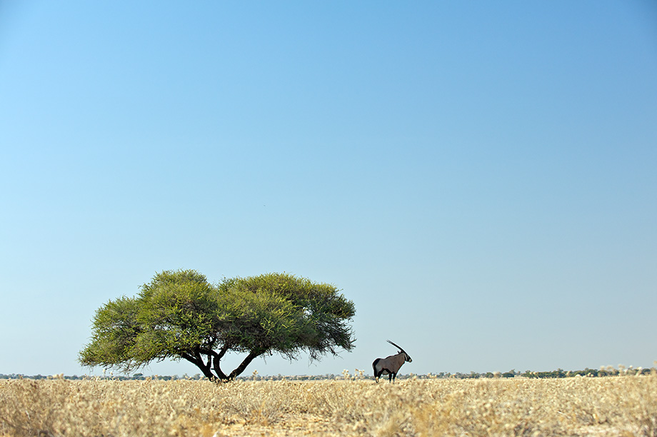 It gets very hot in the Kalahari desert in the middle of the day. This is when every creature seems to be looking for a place to cool off. In this particular photo, an oryx finds relief in the shade of an acacia tree.