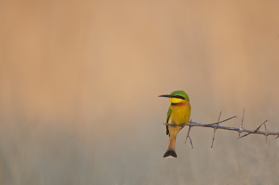 This little bird is called a little bee eater. They are fairly common throughout much of Africa. This one was in the Okavango Delta of Botswana. I liked the nice clean background and tried to include more of it in the composition.