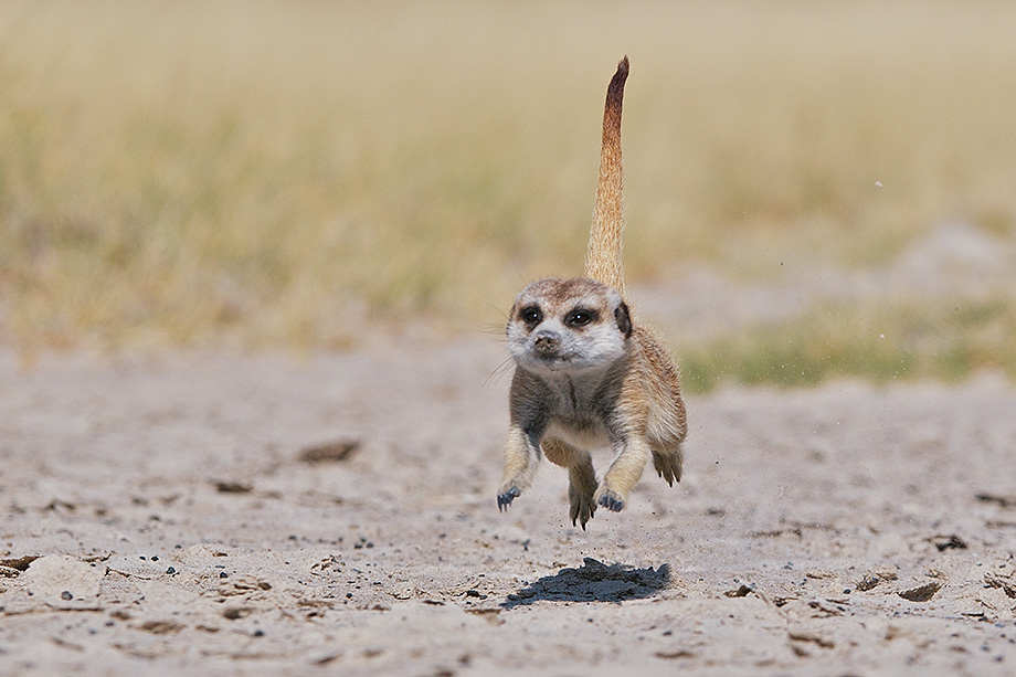 Every now and again, the meerkats would make a mad dash across the open sections of the salt pan. It was in these grassless areas that they were more susceptible to predators. I was never quite sure which direction they would run, but occasionally I guessed right and was able to get into position to get shots of them running toward camera.