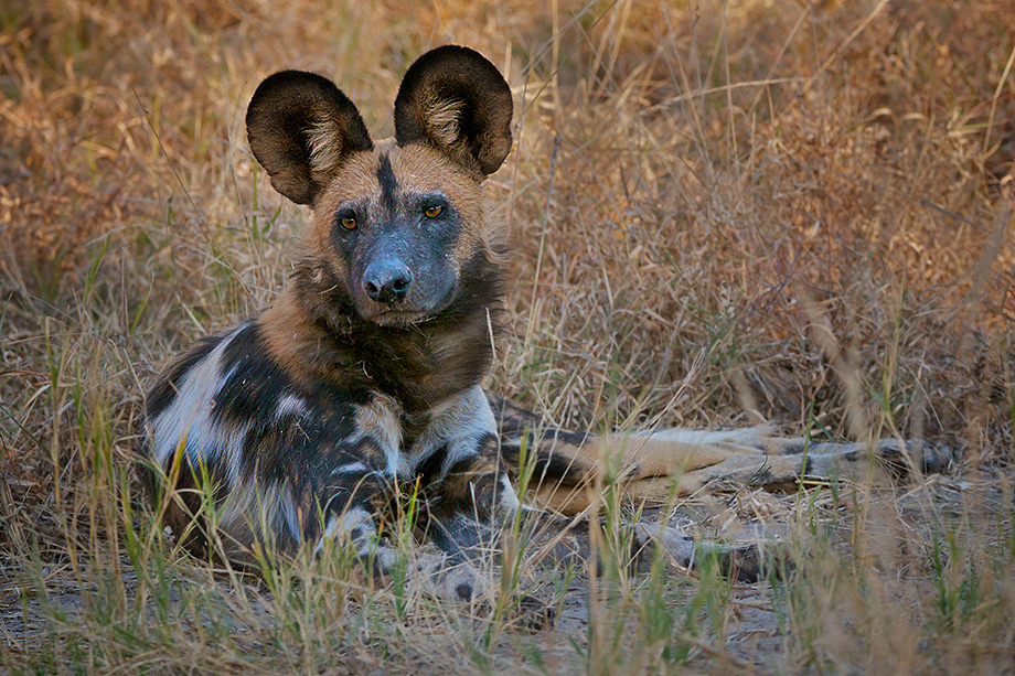 Here’s another of the African wild dogs that I saw in the Linyanti Swamp area of Botswana. There were probably 12 or so dogs in the pack. They all have the painted spots on their coats and very large ears. Like most members of the dog family, they pursue their prey in a long open chase. 80% of the time, the hunt ends in a kill (compared to only about 30% for lions).