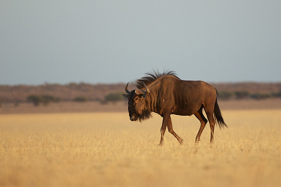 Wildebeest don’t get much respect. In fact, their awkwardly gangly appearance has led to the description — made up of all the unwanted parts from all the other animals on the savannah. They also happen to be very tasty to top predators like lions. Usually they roam in large herds, but this guy was walking alone across the desert in the Central Kalahari — an area not particularly teaming with predators, but certainly not devoid of any either.