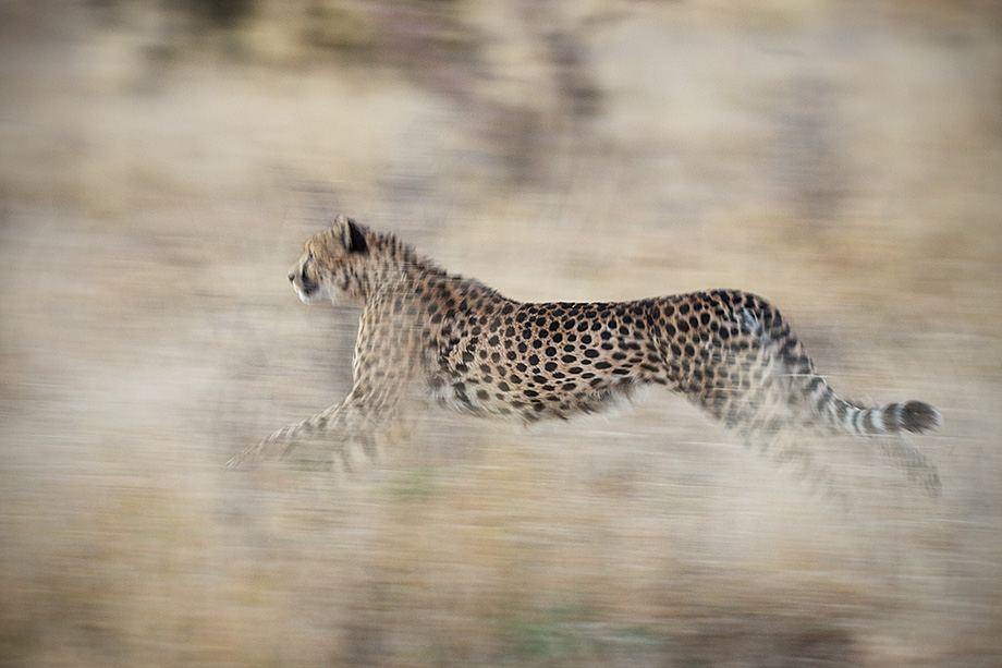 Once again, the cheetah brothers that I saw two nights in a row in the Linyanti Swamp area of northern Botswana. These are the same cheetahs in the photo that I sent a few weeks ago, perched on top of the termite mound. It was getting dark and they were surveying the area for a late dinner. When they began to look impatient — as if about to attack — I switched my camera to a slow shutter speed to capture the motion blur. They took off at the exact same time, but I believe both photos are of the same cheetah.