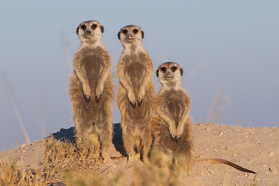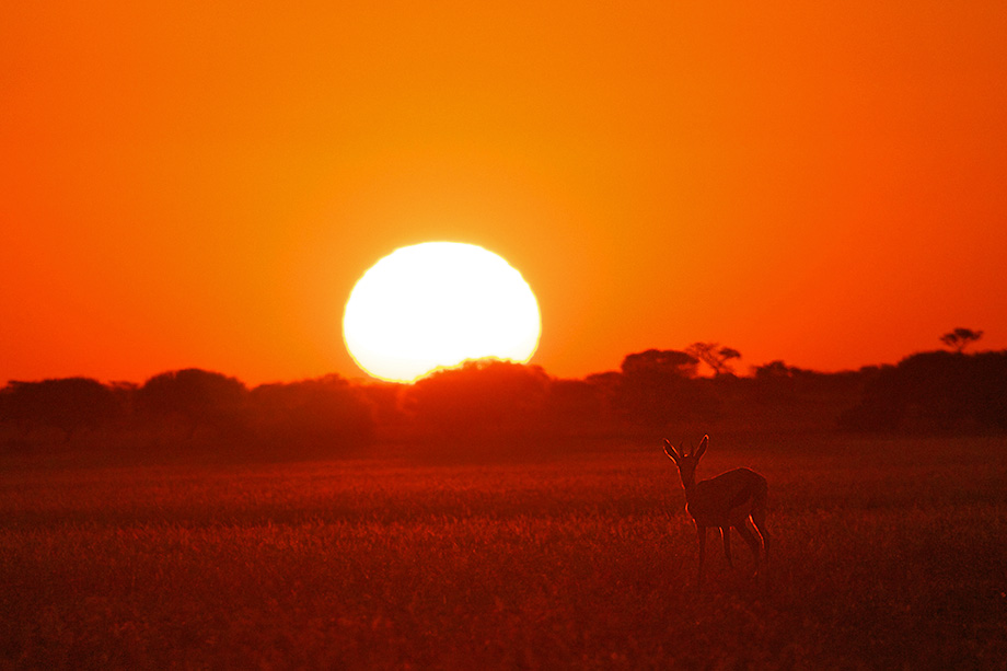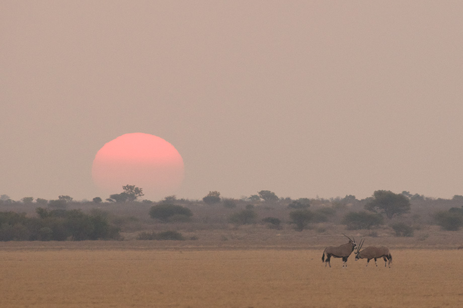 A week in the Kalahari Desert provided many opportunities like this with a big red sun on the horizon. On this particular occasion, the haze in the atmosphere worked to my advantage by lessening the sun’s brightness and allowing me to easily capture a non-silhouette shot of the two oryx. Oryx, also called gemsbok, are a larger antelope species. Both males and females have long, straight horns that can be lethal at times — even known on occasion to kill lions.