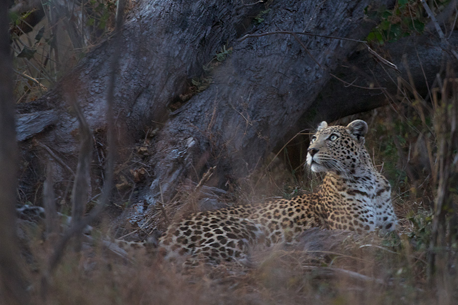 I saw three leopards in Botswana but only got decent looks at this one. We followed through the forest for about 30 minutes. It was very dark as the sun had already set, but despite the lack of light I was able to photograph her in a variety of settings. I kind of liked this one as she seemed quite curious about something up in the tree. This one goes out to another cat that I know that has had a rough couple of days.