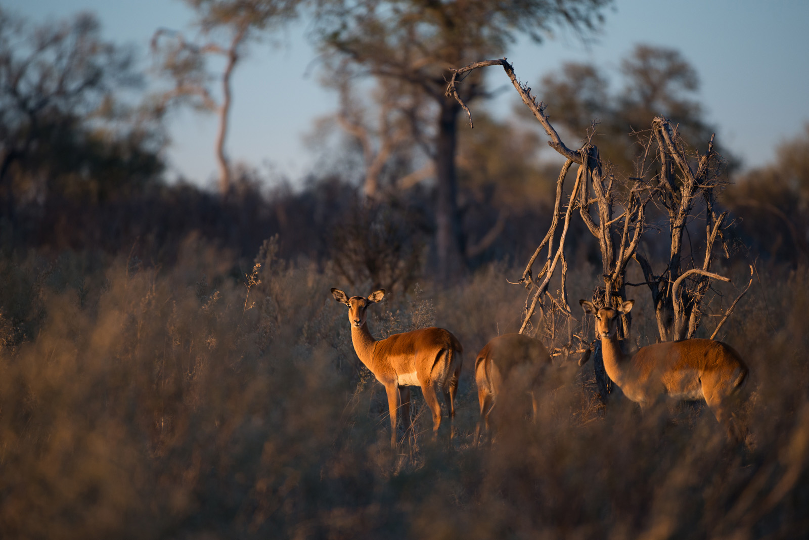 Botswana can present a photographic challenge with all its dry scrubland and bright sunshine. Not always a good combo for pleasant images. But when that African sun is low on the horizon, even the dead bushes can look great if the subjects are catching the light just right. I spotted this small herd of impala early in the morning in the Linyanti Concession. About twenty minutes later, the lighting conditions quickly deteriorated. Of course, that made it the perfect time to put the camera down and just enjoy the amazing sights and sounds that only Africa can provide. Nikon D800 with Nikkor 200-400mm lens (at 400mm) ISO 800, f/4 at 1/800th of a second.