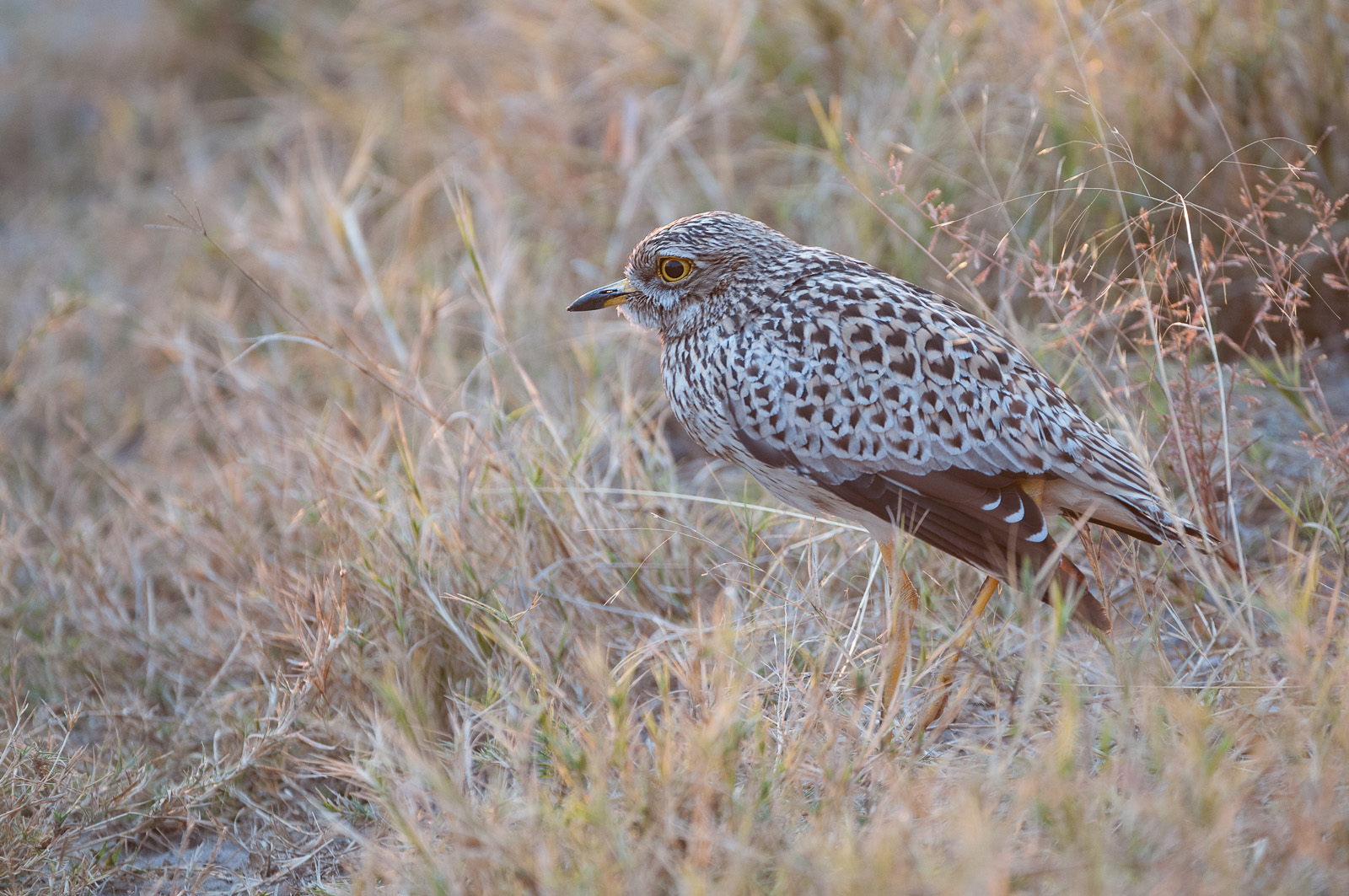 This is the spotted thick-knee, also known as the spotted dikkop or Cape thick-knee. As the name would suggest, those knees are pretty thick. Thick-knees are also pretty smart, often faking an injury to draw predators away from a nest. They range throughout much of sub-Sahara Africa, preferring grasslands and savanna where they spend the majority of their time. Nikon D300 with Nikkor 200-400mm lens (at 400mm) ISO 400, f/4 at 1/200th of a second.