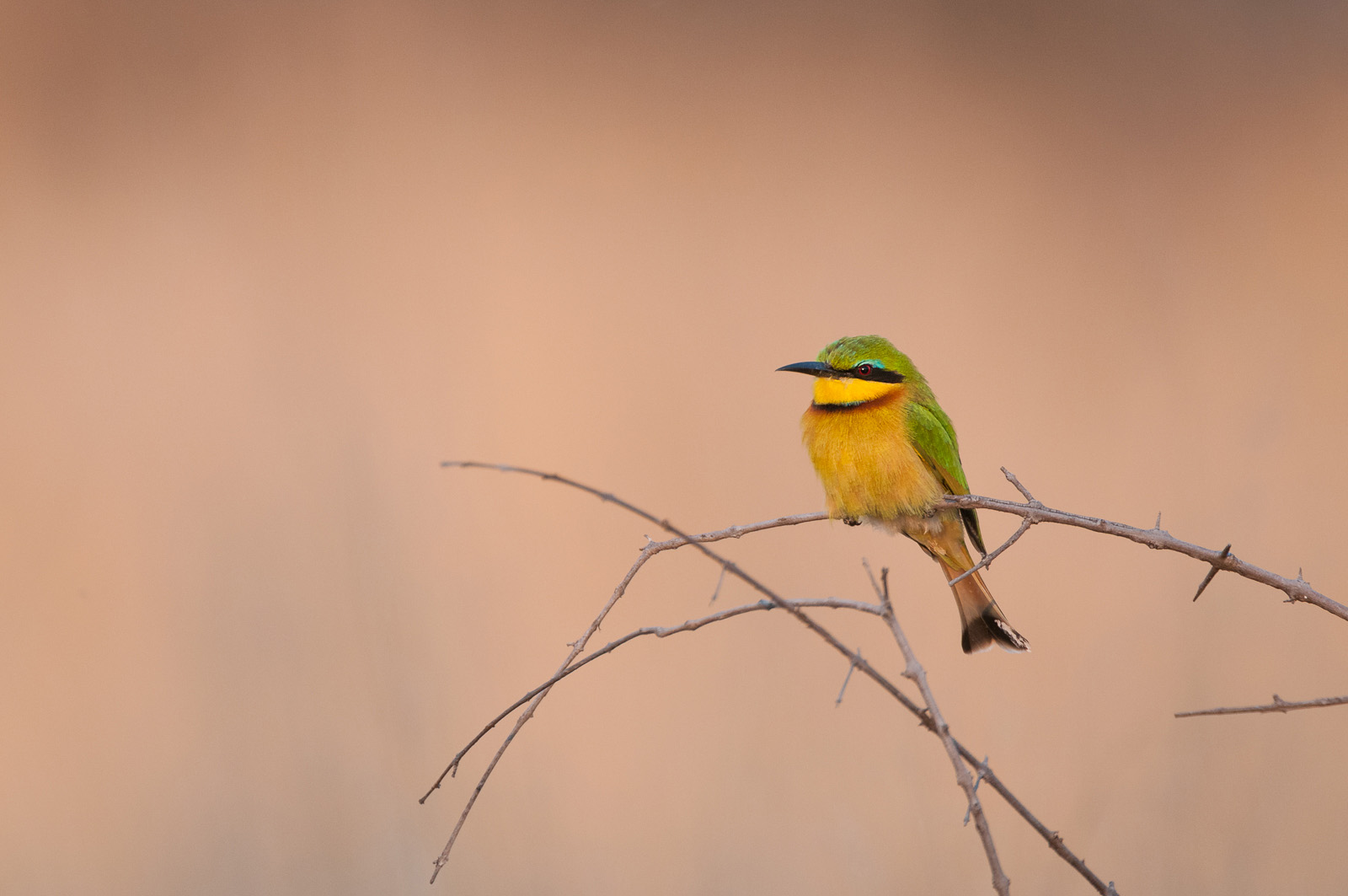 The little bee eater is a very common bird throughout most of sub Sahara Africa. In fact, it is estimated that there are between 60 and 80 million of them. That said, always great to see their pleasantly bright yellow and green plumage and blue eyebrow above that red eye. Both males and females share the same appearance. Nikon D300 with Nikkor 200-400mm lens (with 1.4 teleconverter attached for 550mm) ISO 400, f/5.6 at 1/400th of a second.